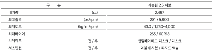 엔진은 가솔린2.5 터보 한가지를 운용하며, 디젤은 없습니다. 최고출력 281마력에 43토크를 내는 엔진인데요. 아주 충분한 성능을 보여줍니다.