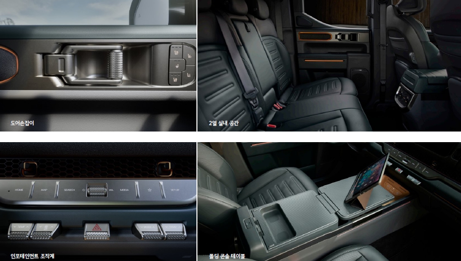 트럭에 걸맞게 손잡이나 스위치등등은 큼지막하게 직관적으로 나와있습니다. 1열 중앙 콘솔부분은 접이식으로 펼쳐놓으면 하나의 탁자가 됩니다.
