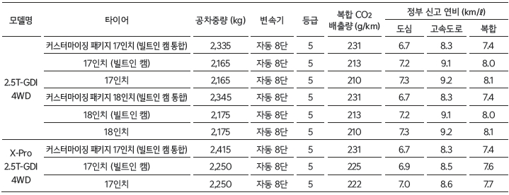 공차중량에 따라 타이어와 휠사이즈에 따라 연비는 달라집니다. 모두 5등급을 받았고, 도심은 대략 6~7, 고속도로는 8~9수준으로 공차중량이 2톤이 넘기때문에 연비에 대한 기대는 접는것이 좋습니다. 복합연비가 기본모델조차 9를 넘지 못하기때문에 연료비용은 상당히 나올것으로 보이네요. 특히나 터보모델특성상 고급유를 넣어주는게 좋아보이네요.