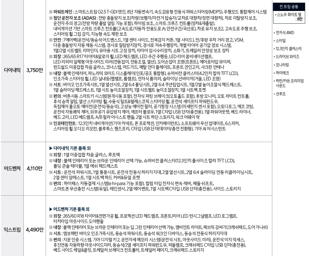 일반 모델은 3750만원부터 시작합니다. 하지만 깡통을 구매하실분은 아마도 없을것입니다. 최소한 모니터링, 전자식사륜시스템은 넣어주는것이 좋을것으로 보이네요. 개인적으로는 어드벤처 트림에 12.3인치 클러스터, 드라이브와이즈, 모니터링 이정도의 옵션을 추가하는걸 추천드립니다.