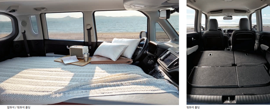 1열까지 풀플렛이 가능합니다. 이렇게 하면 좁은 실내를 중형급으로 확 넓힐수가 있죠. 1인또는 2인 차박에도 충분한 공간이 나옵니다.