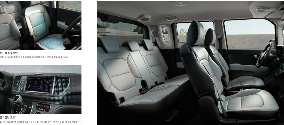 모닝과 마찬가지로 운전석은 통풍시트 추가가 가능합니다.거기에 공기청정기능을통해 자동으로 유해공기의 실내유입을 막아줍니다.