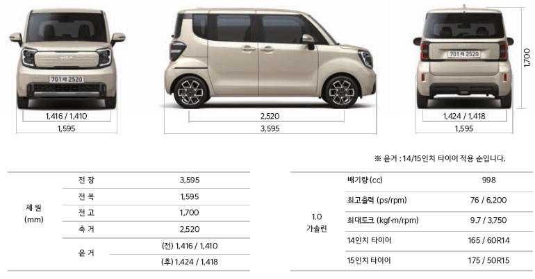 엔진은 모닝과 동일한 1.0 가솔린 한가지입니다. 기존에 1.0 터보모델도 있었는데요. 단종된것이 무척 아쉽습니다. 아무래도 덩치가 있는 경차이기도 하고 짐을 싣는 경우가 많아서 힘이 좀더 필요해 보입니다.