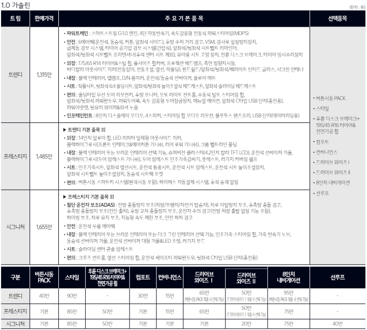 연비는 복합 14~15수준입니다. 엔진은 1.0 가솔린엔진 한가지이고, 힘은 76마력입니다. 사실 터보모델이 아쉽네요. 기타 모든 사양은 경차기준에 최대치로 맞추었네요.