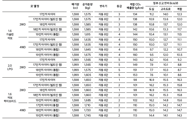 연비는 1.6 가솔린터보의 경우 타이어사양에 따라서 다르지만 2륜구동모델이 연비가 좋고 4륜모델이 좀 떨어지는걸 알수있죠. 가솔린모델은 10~14수준이라고 보면되고, lpg 는 7~10 수준으로 보면 되겠습니다. 하이브리드연비는 도심이 고속도로보다 연비가 좋기때문에 짧은거리 시내위주라면 무조건 하이브리드를 추천드릴수 있겠습니다. 15~16 수준으로 도심과 고속도로 연비차이가 거의 나지않습니다.