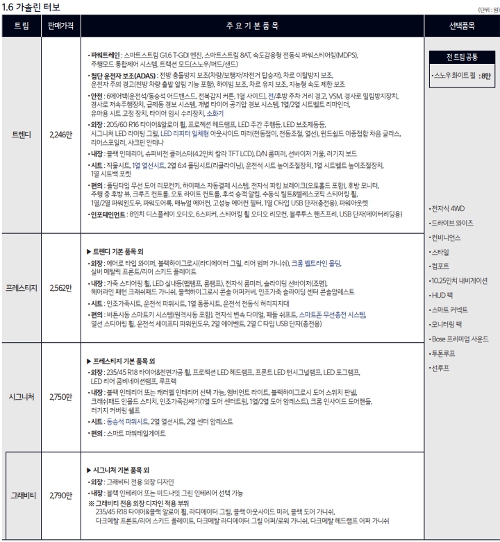 1.6터보 모델은 2246만원부터 시작합니다. 개인적으로는 프레스티지트림보다는 편의사양이 대폭 올라간 시그니처 모델을 추천드립니다. 거기에 내비게이션과 모니터링, 드라이브와이즈정도만 추가하면 가성비로 좋아보이네요.
