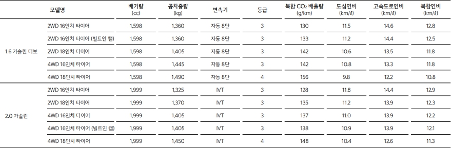 2.0 모델은 터보모델보다 100만원가량 저렴합니다. 옵션은 동일하다고 볼수 있습니다.