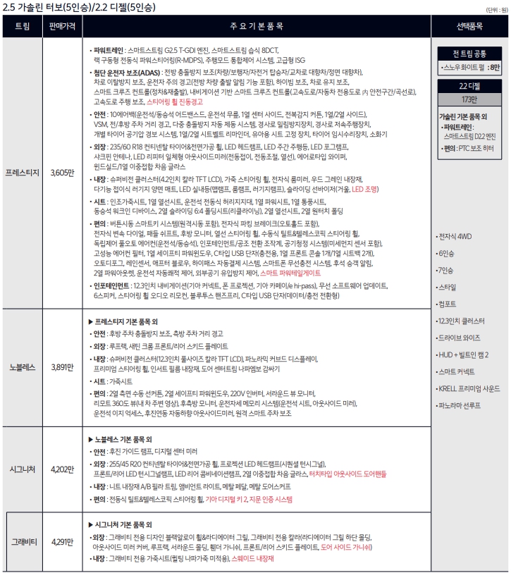 기본적으로 1.6 터보모델과 2.2디젤모델은 사양이 동일합니다. 엔진차이와 미션차이만 있습니다. 필요에 따라서 고르면 되겠습니다. 디젤은 173만원을 추가하면 변경가능합니다.