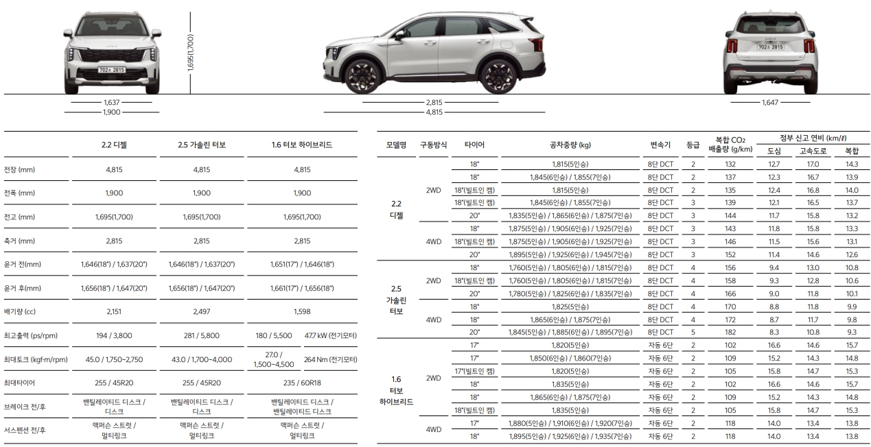 2024 기아 쏘렌토 가격표 및 제원(엔진, 견적내기)