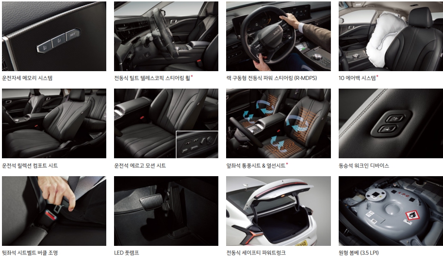 기본적으로 트림은 한가지이고 옵션은 총 4가지를 선택할수 있습니다. 기본적인 안전사양은 기본적용되어있고, 가죽시트가 기본입니다. 뒷좌석특화옵션은 60만원이 추가하면 되는데 뒷좌석 열선시트, 썬커튼, 중앙센터 암레스트 등이 추가됩니다. 각종 안전옵션과 운전자보조기능이 있는 드라이브와이즈도 필수사양이라고 생각됩니다.