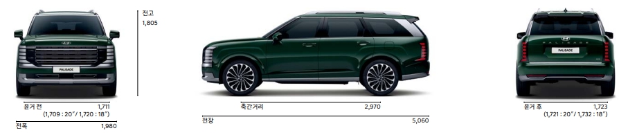 사이즈는 기존대비 약간 늘어났습니다. 길이는 5미터가 조금넘는 사이즈이고 폭이 1980으로 카니발만큼 넓어졌습니다. 측면 이미지는 기존 펠리세이드가 약간 뚱뚱한 느낌이었다면 신형은 조금 날렵한 이미지를 가지고 있네요.
