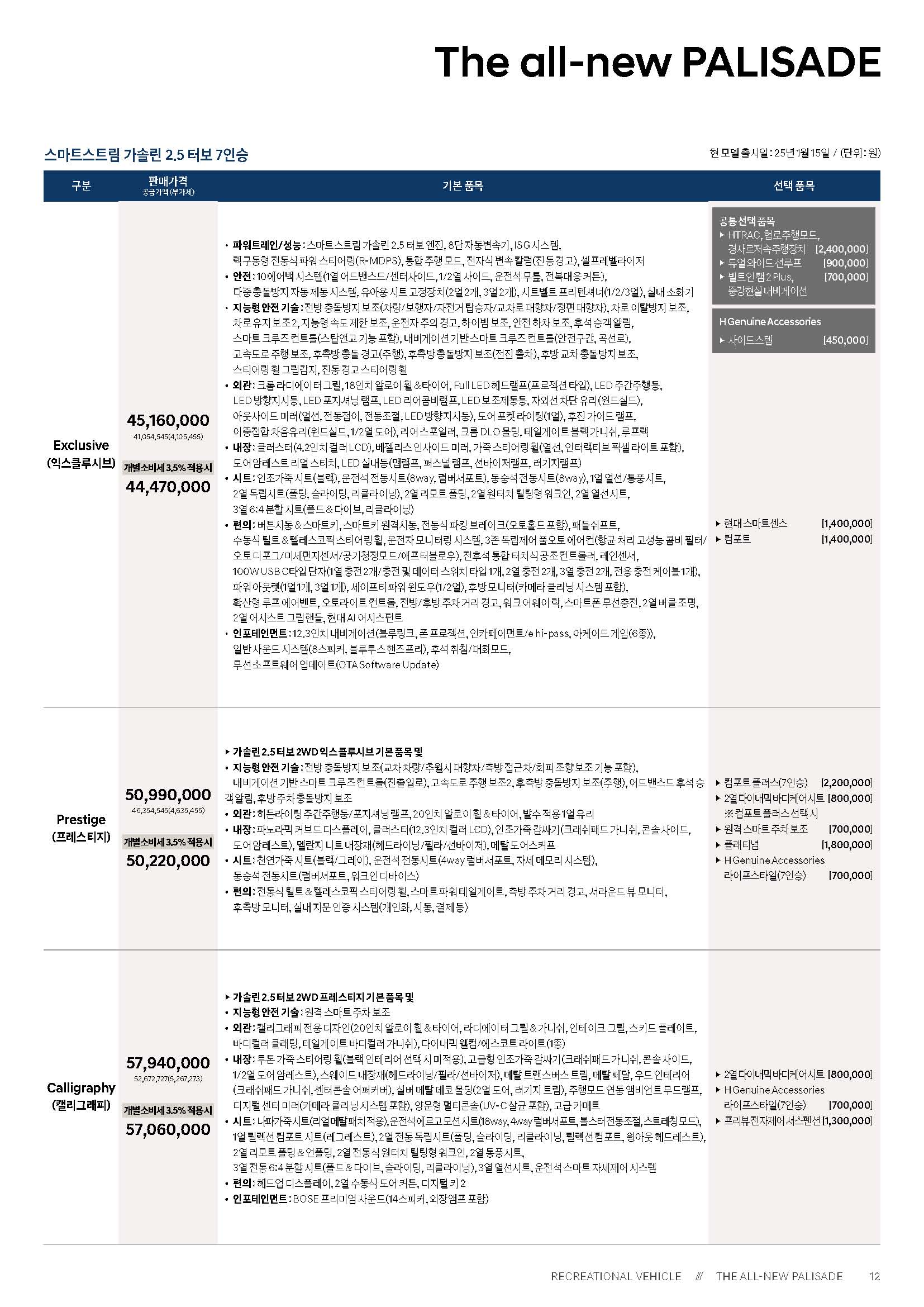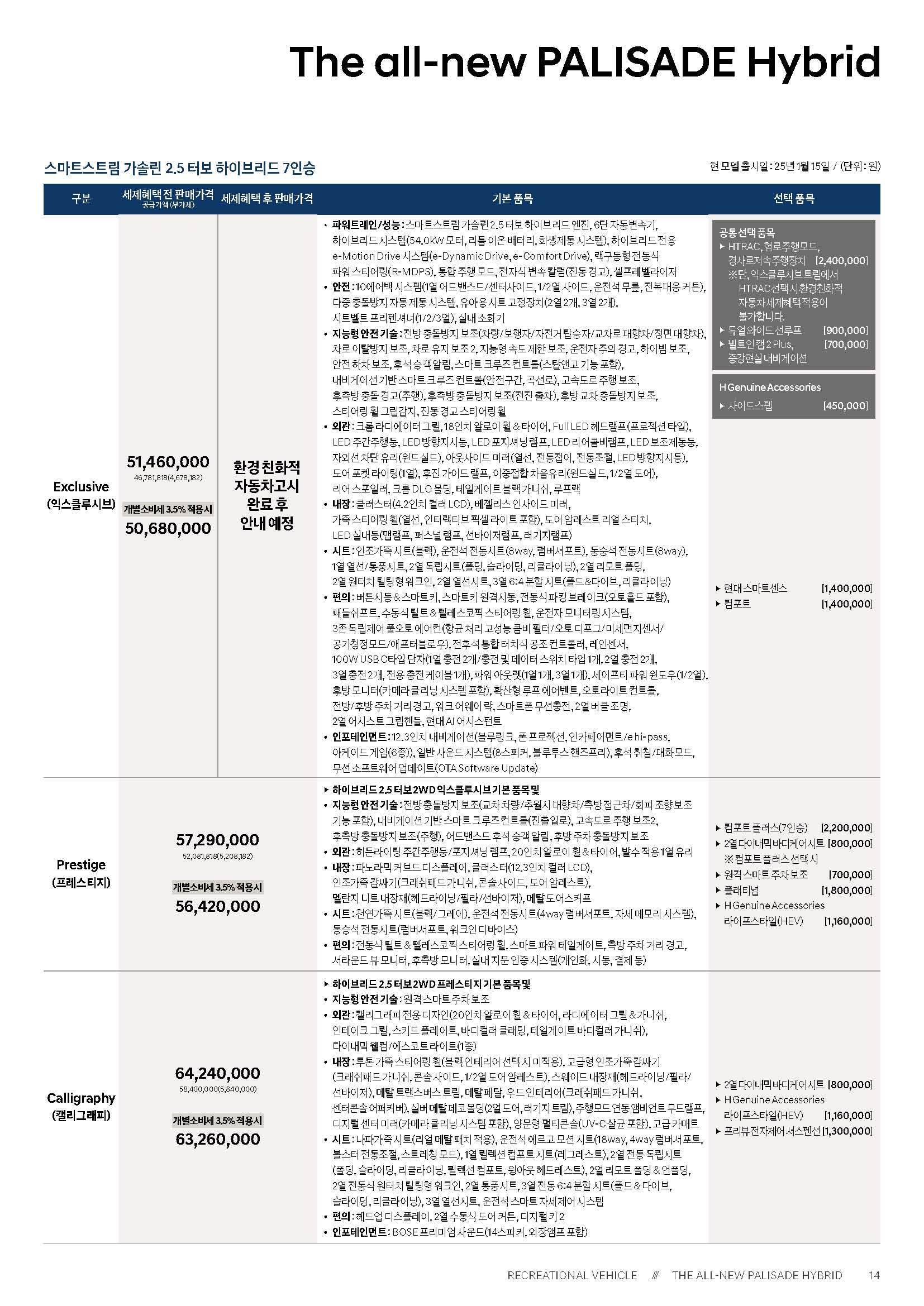 기본 2.5 터보모델은 4380부터 시작합니다. 기본만 구매해도 매리트는 있겠지만 스마트센스나 컴포트정도는 추가해주는게 좋을거 같네요. 결론은 깡통모델도 5000이상 줘야 살수가 있다는 것입니다. 어느정도 옵션을 누리겠다 싶다면 5500만원정도는 되야 좋을것으로 보이네요.