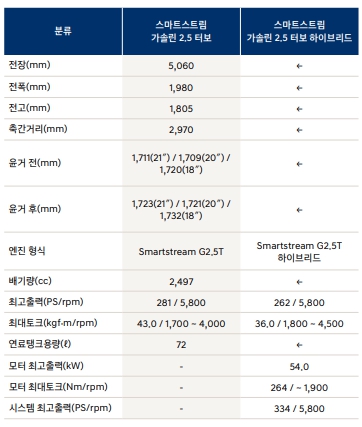 엔진은 가솔린 2.5터보와 2.5 터보 하이브리드 2가지입니다. 2.5 터보는 281마력에 43토크를 냅니다. 덩치에 비해서는 차고넘치지는 않지만 부족하지도 않은 사양입니다. 터보하이브리드는 거기에 모터출력이 더해져서 334마력의 힘을 냅니다.