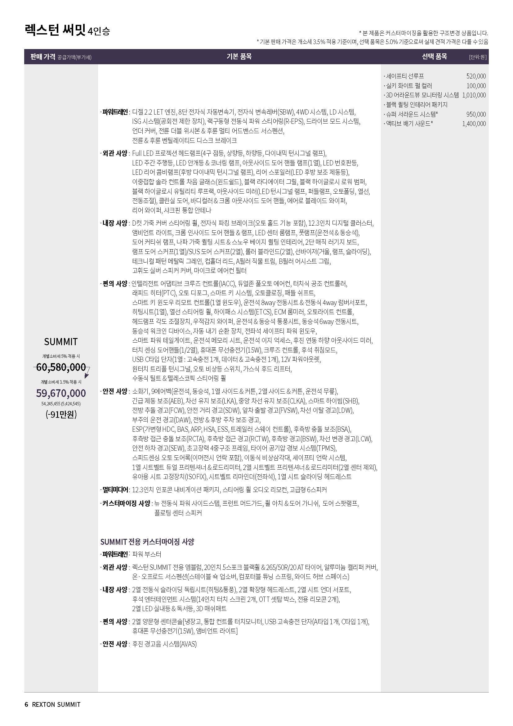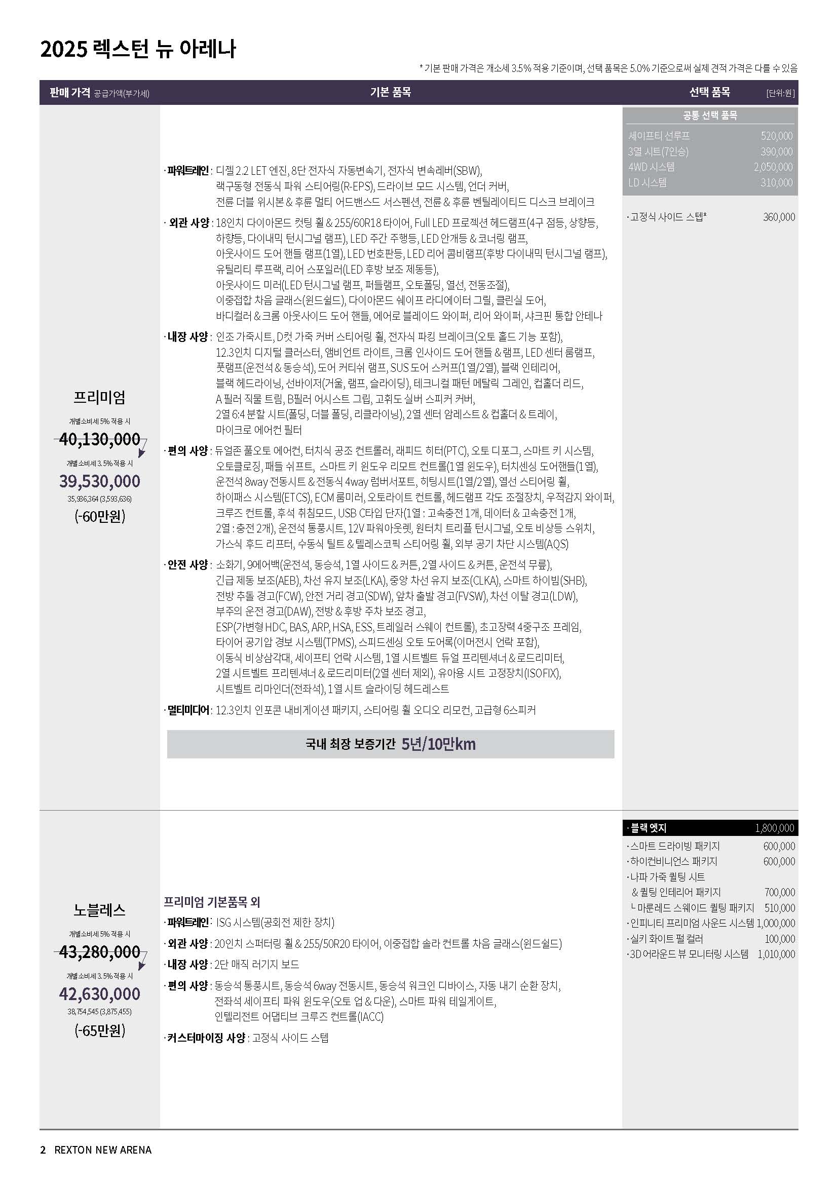 3900만원대에서 구매할수 있는 수준으로 사양에비해서는 확실히 가격경쟁력이 있습니다. 더군다나 프레임바디로 튼튼하고 커다란 외관을 가지고 있기 때문에 안전성부분에서도 상당한 잇점이 있죠. 옵션은 따로 안넣어도 될만큼 풍부합니다. 여기에 고급화를 시키고 싶다면 노블레스 트림을 하면 되는데요. 4200만원수준이지만 옵션에서 3d어라운드나 스마트 드라이빙 패키지등 필수적인 고급옵션을 넣는것을 추천드립니다.