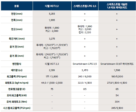 엔진은 디젤 2.2와 lpg 3.5 , 1.6 터보 하이브리드가 있습니다. 주로 디젤엔진이 판매가 되는데요. 최근에는 하이브리드도 많이 팔리는 추세입니다. 디젤은 177마력에 44토크로 일상 주행시 아무런 지장이 없는 수준이죠. 하이브리드는 180마력에 27토크입니다. 모터출력까지 더하면 245마력의 큰힘을 발휘합니다.