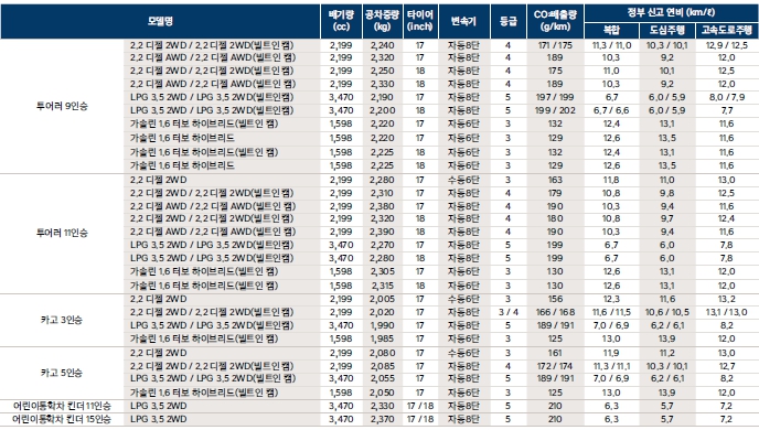 연비를 살펴볼께요. 모델에 따라서 차이는 있지만 디젤모델은 도심 9 고속도로 12~13 수준으로 평이한 정도이고 lpg모델은 평균 8정도 나옵니다. 하이브리드는 디젤과 평균은 비슷한데 시내주행시 13키로를 보여주기 때문에 시내주행이 많다면 하이브리드도 좋은 선택입니다. 연료비차이를 고려하면 사실 연비는 디젤과 하이브리드가 비슷하다고 볼수 있겠네요.