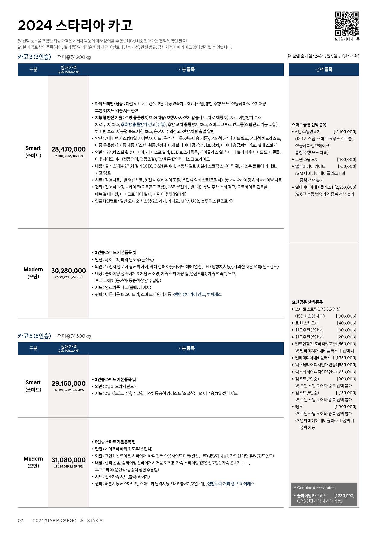 일반 11인승모델은 3000만원수준으로 학원이나 다인승으로 주로 이용하는 경우 적당한 가격에 좋은 선택이 될수 있습니다. 9인승모델은 3238만원으로 2열이 캡틴시트라서 3열에 탑승하기가 아주 편합니다. 소상공인의 배송용으로 많이 쓰이는 카고모델은 3인승과 5인승이 있습니다.
