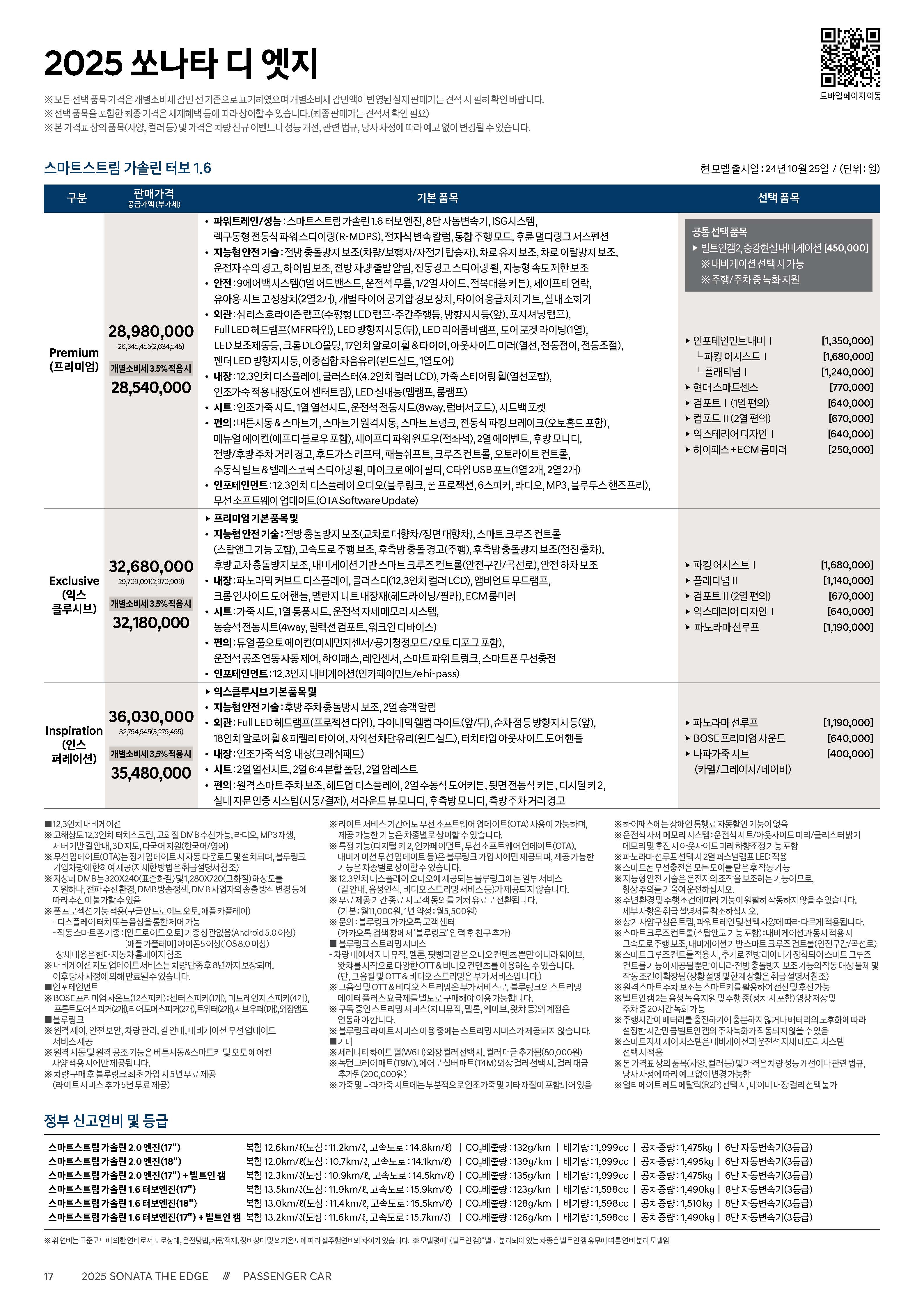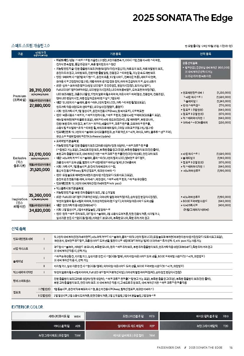 ===쏘나타 가격표===