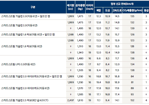 연비는 가솔린 모델들도 좋은데요. 도심 10키로 이상나오고 고속도로는 14까지도 나오네요. 하이브리드는 공식연비가 복합 18~19까지 나옵니다. 시내주행과 장거리가 많다면 하이브리드 추천드립니다.