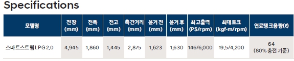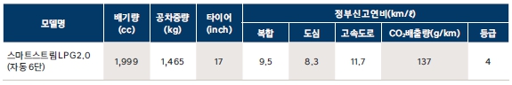 엔진은 2.0 LPG 엔진 한가지로 146마력과 19.5토크를 만듭니다. 일반적인 시내주행에서는 부족함이 없어 보이지만 여러명탑승이나 집을 넣었을때는 조금은 부족한 성능이라고 할수 있겠네요.