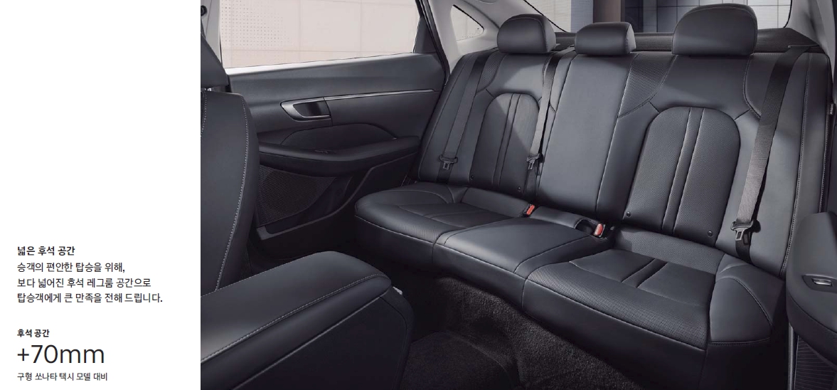 후석공간은 기존모델대비 70미리나 넓어 졌습니다. 후석 손님이 보다 편안하게 이동할수 있도록 설계가 되었습니다.