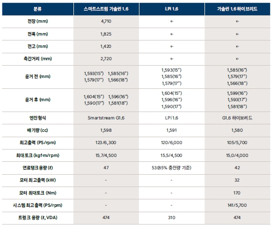 일반모델 엔진은 가솔린 1.6 자연흡기와 lpg 1.6 , 그리고 1.6 가솔린 하이브리드 3가지 입니다. 1.6 가솔린은 최고출력 123마력에 15.7 토크를 냅니다. 저속시에 경쾌한 움직임을 위해서 셋팅이 약간 몰린 느낌이고, 중속이상은 상당히 더딘 모습입니다. 1.6 하이브리드모델은 모터출력까지 더해서 141마력을 냅니다. 확실히 하이브리드가 여러모로 이상적인 모델입니다.