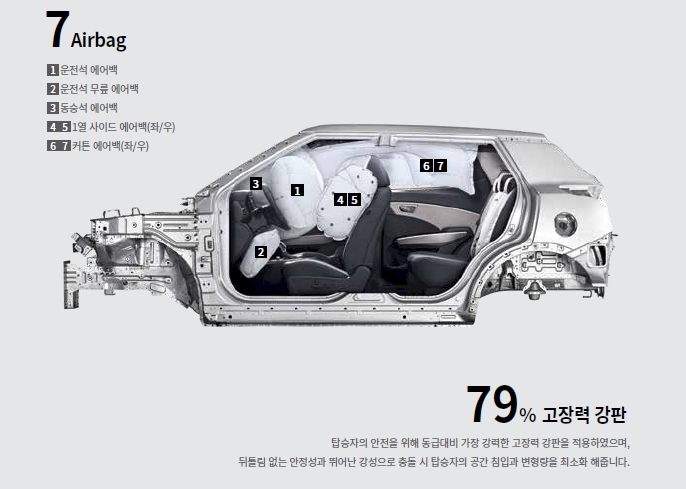 7에어백과 79%의 고장력강판을 사용하여 안정성을 보장받을수 있습니다.