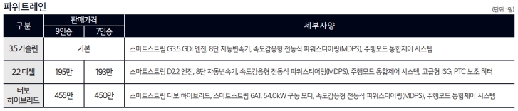 2024년식을 거쳐오면서 디젤은 사라질것이라고 예상했지만, 의외로 2.2디젤은 유지되고 있습니다. 아무래도 연비와 세금의 부담도 있기때문이 아닐까 하네요. 특이한점은 그동안 없던 하이브리드모델의 추가인데요. 아쉽게도 친환경세제혜택은 받지 못합니다. 연비가 기준에 맞지않기 때문입니다. 기본적으로 가장 많이 판매되는 모델은 하이브리드 모델인데요. 상당기간 대기를 해야만 합니다. 3.5 가솔린이나 2.2디젤은 대기기간이 길지않습니다. 그만큼 하이브리드 수요가 많다는 것이겠지요!