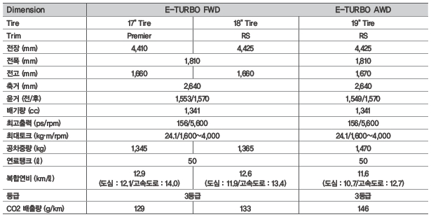 엔진은 1.4 터보가솔린으로 156마력과 24.1토크의 준수한 성능을 자랑합니다. 이정도성능이라면 일반주행에서 전혀 부족함이 없는 수준입니다. 연비는 도심 12, 도속도로 14수준으로 소형 suv중에서 평균이상을 보여줍니다. 6단자동변속기를 채택하고 있으며 과거의 악명높던 미션에서 많은 부분 개선된 모델입니다.