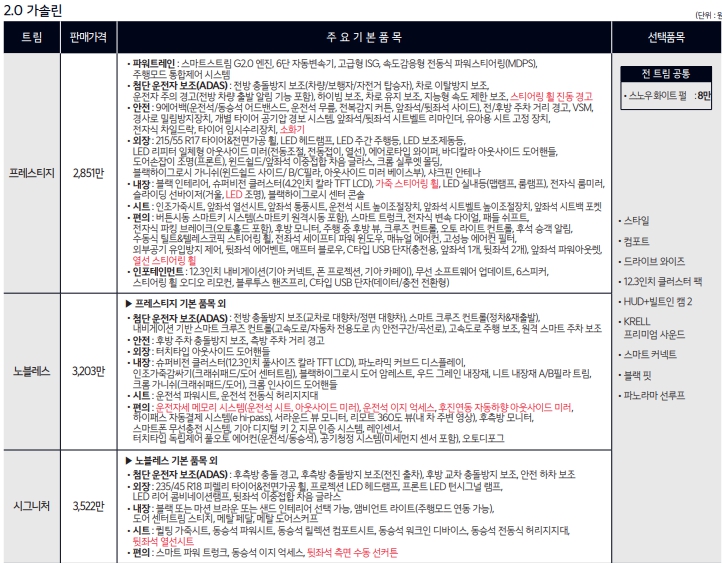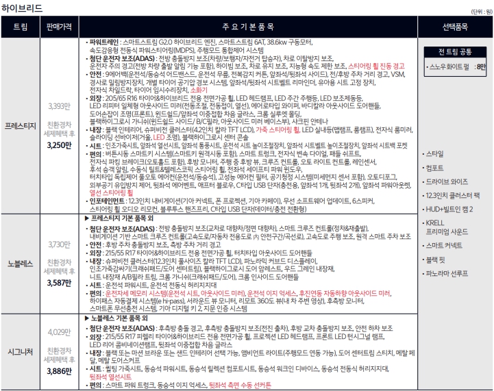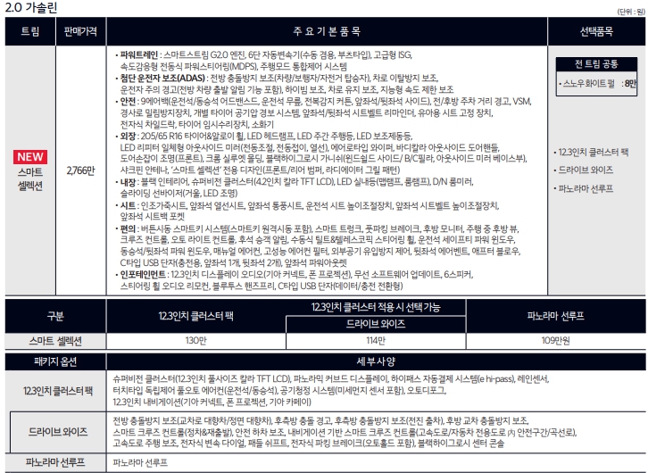 기본적으로 가솔린과의 가격차는 400만원입니다. 크지않은 가격차이로 하이브리드에 몰리는 추세인데요. 이번에 2.0 가솔린모델에 실속형 트림이 생겼습니다.스마트셀렉션이라는 모델인데요. 2766만원에 필요한 옵션을 더해도 3천안쪽으로 구매가 가능한 모델입니다.