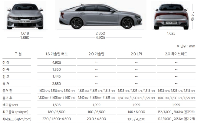 2025 K5 제원과 가격표 (연비, 하이브리드)
