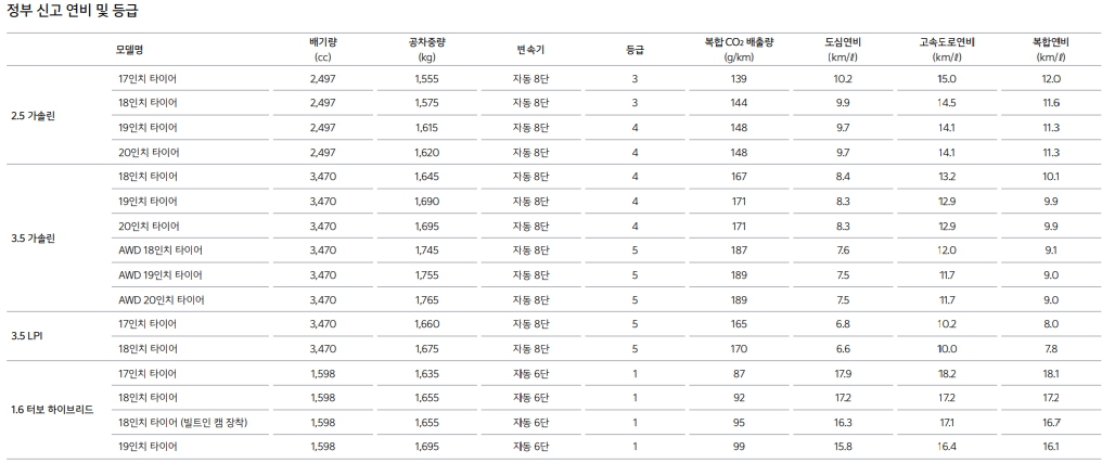 연비는 2.5가솔린 복합 12, 3.5가솔린 복합 10.1, 3.5LPI 복합 8, 1.6하이브리드 복합 17입니다. 이것은 제조사의 최대치로서 타이어와 엔진사양등에 차이로인해 약간씩 오차는 있습니다.