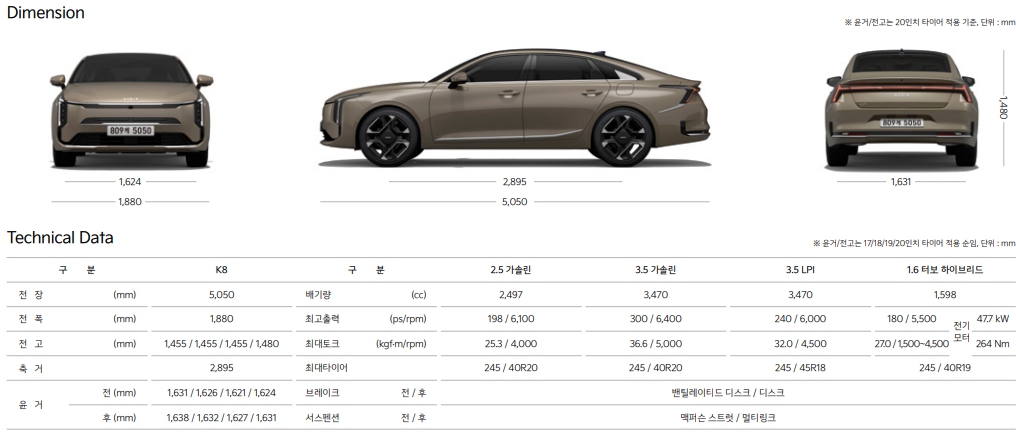 K8은 페이스리프트 버전이므로 기존 엔진파워트레인은 동일합니다. 2.5가솔린, 3.5가솔린 3.5LPI, 1.6 터보하이브리드 4가지 파워트레인을 가지고 있으며, 기존과 같은 힘을 냅니다. 기본모델은 2.5가솔린으로 출시된지 오래된 엔진입니다. 단점도 있는 엔진이지만 성능에대한 검증은 충분히 이루어졌지요. 역시나 최근의 트랜드답게 하이브리드모델은 오랜기간 기다려야 받을수 있습니다.