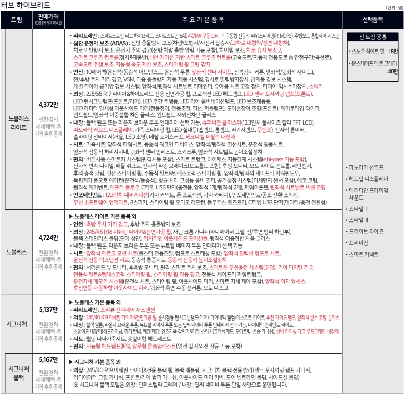 정확한 가격과 옵션사양은 공식 PDF 를 통해 확인할수 있습니다.