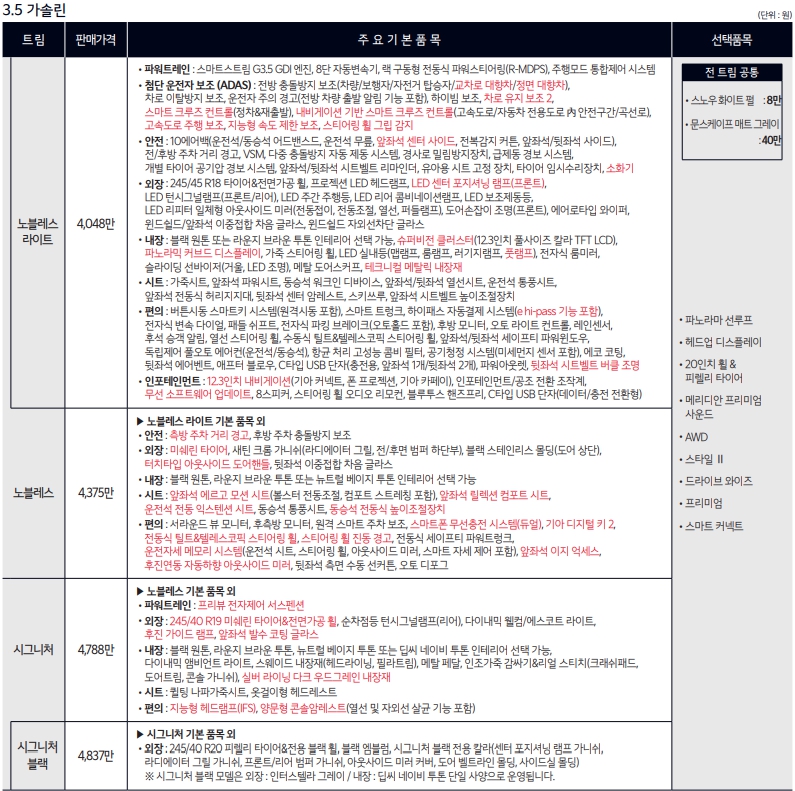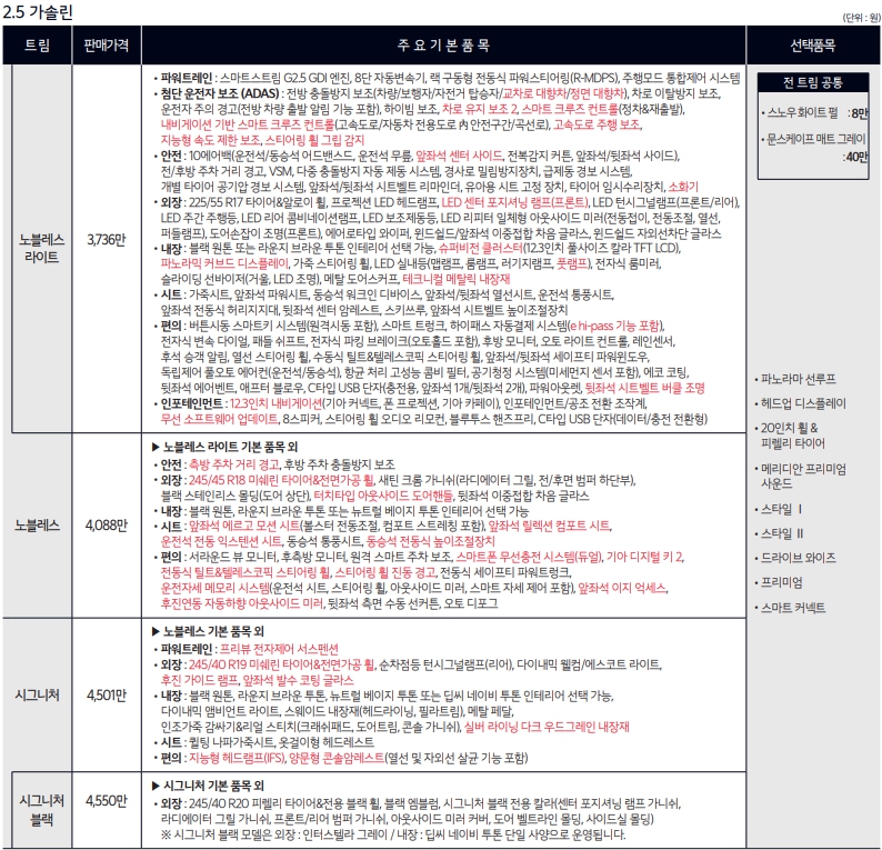 2.5 가솔린가격입니다. 페이스리프트가 단행되면서 대략 400만원이 오른 3700만원대에 기본가격이 형성되었는데요. 이제는 기본모델도 옵션을 몇개 넣으면 4000만원이 넘는 시대가 왔습니다. 가격에서 어느정도 그랜저에 우위를 가지고 있었는데요. 이제는 거의 비슷한 선상에서 경쟁하게 되었네요.